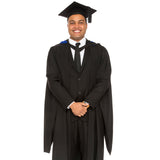 This set includes a black graduation gown, premium felt mortarboard (also called a graduation cap or trencher cap) with soft folding cup and academic hood lined with blue. Suitable for use at UQ master's graduation ceremonies.