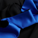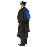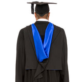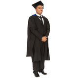 This set includes a black master's graduation gown, premium black felt mortarboard (trencher cap) with soft folding cup and academic hood lined with blue satin. Suitable for use at UQ master's graduation ceremonies.
