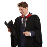 This set includes items that cannot be worn at Murdoch University ceremonies, and are appropriate for use in at-home graduations. It includes a black graduation gown, premium felt mortarboard (trencher cap) with soft folding cup and academic hood trimmed in the colour of your degree.