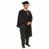 This set includes a black bachelor graduation gown, premium black felt mortarboard (also called a graduation hat or trencher cap) with soft folding cup and academic hood trimmed in the colour of your degree. Suitable for use at UTAS bachelor graduation ceremonies.